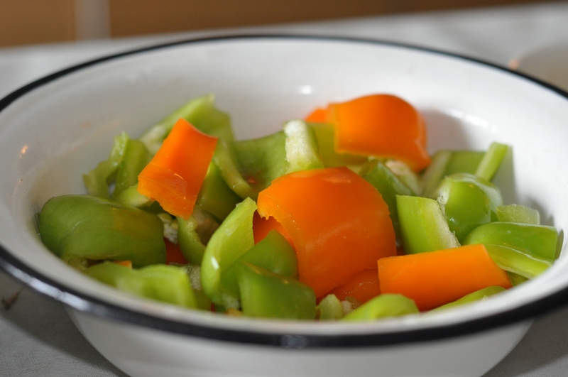 INGREDIENTE (pentru 6 persoane): 6-7 pulpe de pui superioare, dezosate, 3 cartofi, 2 ardei grasi, 3 cepe, 3 rosii